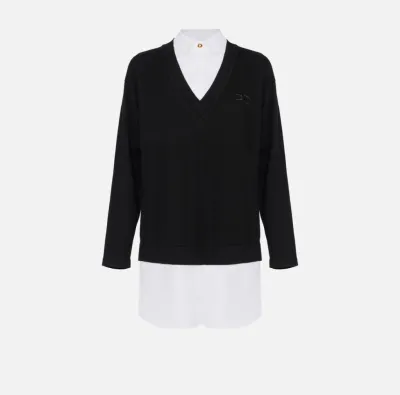 Questo abito firmato Elisabetta Franchi unisce due materiali iconici per creare un look dallo stile contemporaneo e dal comfort impeccabile. La parte superiore, realizzata in maglia di viscosa stretch, avvolge la silhouette con morbidezza, esaltando le forme in modo naturale. Il fondo e i dettagli sono in popeline di cotone, tessuto più strutturato che dona volume e definizione all'intero design.