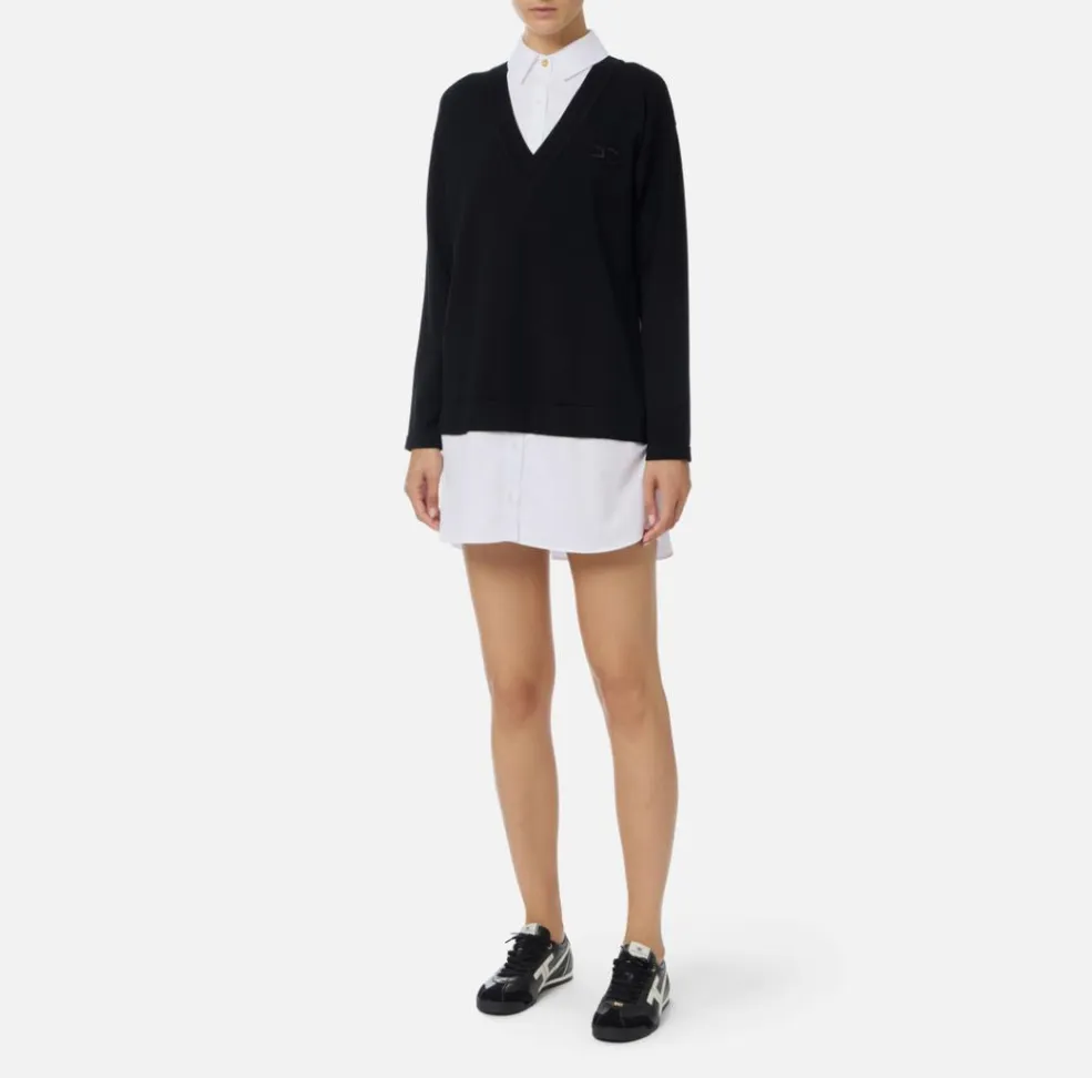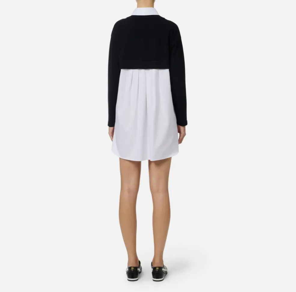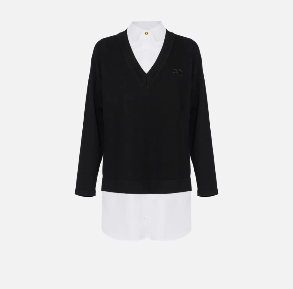Il contrasto tra i materiali crea un elegante gioco di texture, ideale per chi cerca un capo originale ma equilibrato. Il taglio può ricordare una camicia nella parte inferiore, con gonna a balza o pieghe, mentre la parte alta resta aderente e minimale. La combinazione garantisce un look fresco, femminile e versatile, perfetto per il giorno o per occasioni semi-formali.