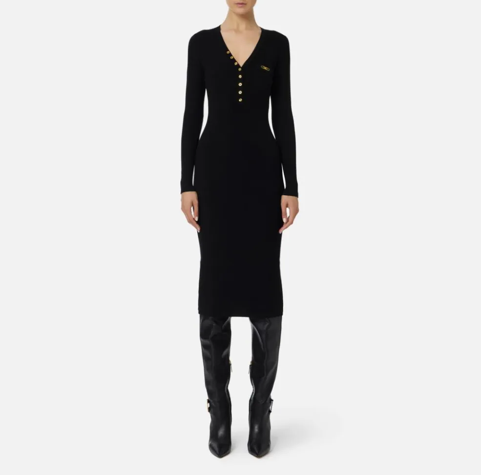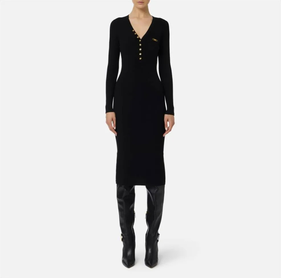 Questo abito in maglia a costine firmato Elisabetta Franchi è un capo chiave per la stagione, pensato per la donna che cerca un vestito elegante ma comodo, perfetto da indossare sia di giorno che in serate più formali.