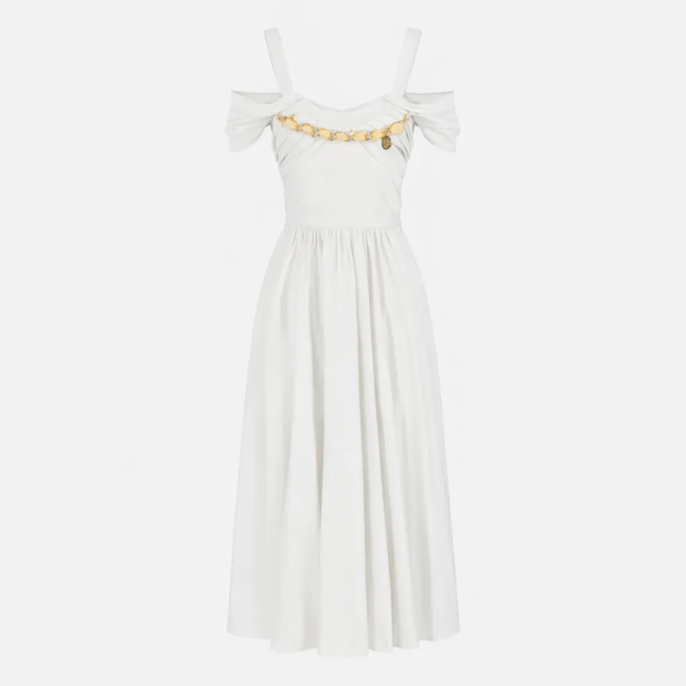 contemporanea, questo abito in cotone stretch con catena gioiello è ideale per