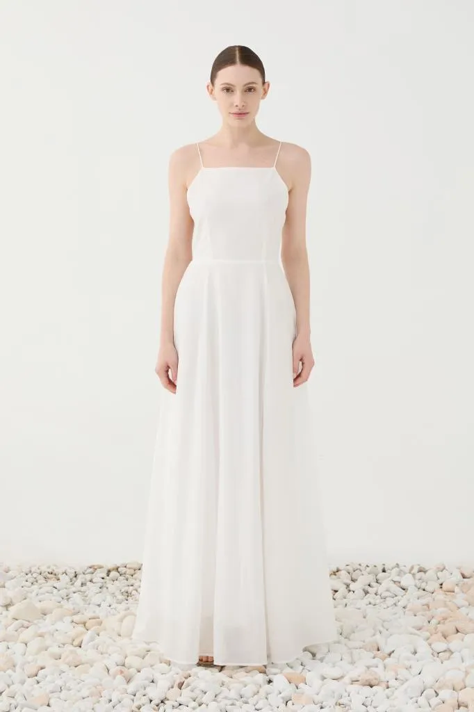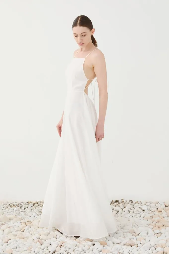 Il design si distingue per il suo taglio pulito ed essenziale: il corpetto dritto con spalline sottili esalta la linea delle spalle con grazia e discrezione, mentre la schiena completamente scoperta, definita da un elegante gioco di laccetti regolabili, aggiunge un tocco seducente e contemporaneo.