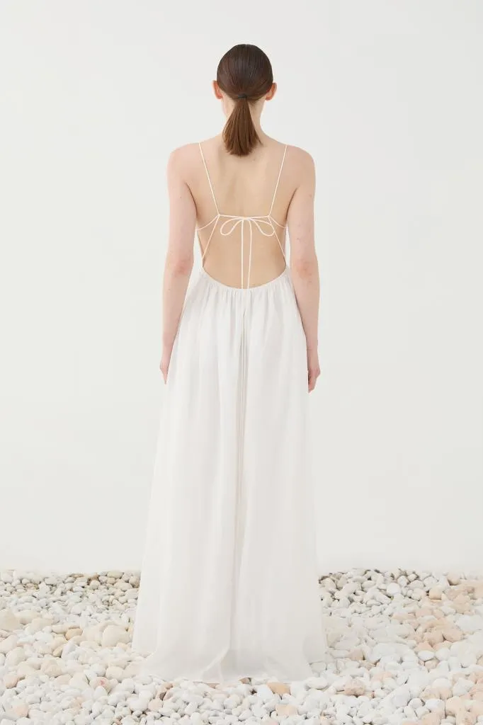 L’abito lungo Eleh bianco con schiena scoperta è una celebrazione della femminilità raffinata e della leggerezza estiva. Realizzato in un tessuto fluido e arioso, questo abito incarna un’estetica minimal chic che lo rende perfetto per cerimonie, eventi serali o vacanze sofisticate.