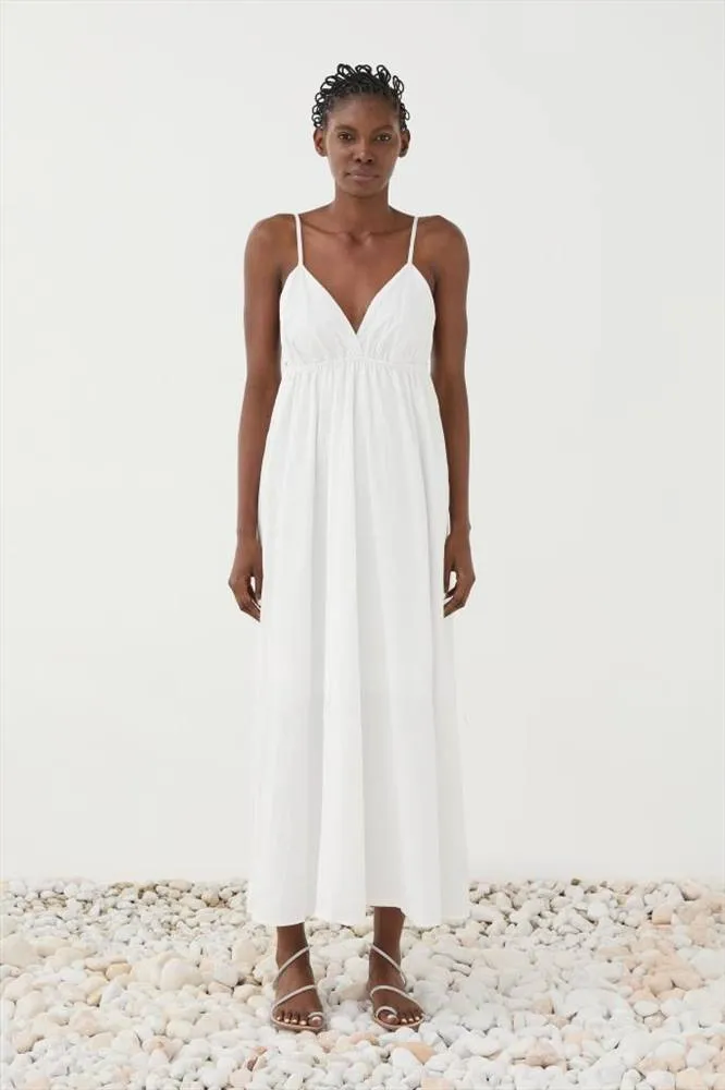 Il colore bianco puro, luminoso e delicato, rende questo abito estremamente versatile: perfetto per cerimonie estive, eventi all’aperto, vacanze o momenti speciali. Può essere interpretato anche in chiave minimal bridal, ideale per un matrimonio civile o una celebrazione informale. Abbinato a sandali flat, gioielli essenziali o accessori naturali, crea un look sofisticato e contemporaneo.