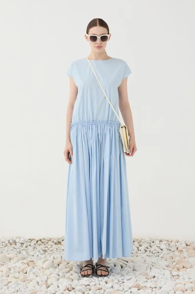 Il modello presenta uno scollo rotondo discreto e maniche corte che donano equilibrio e leggerezza alla silhouette. Il punto focale è la vita arricciata, che definisce delicatamente le proporzioni senza costringere, creando una gonna ampia e scivolata dal movimento armonioso. La lunghezza maxi contribuisce a un effetto elegante e femminile, perfetto sia per il giorno che per occasioni più ricercate.