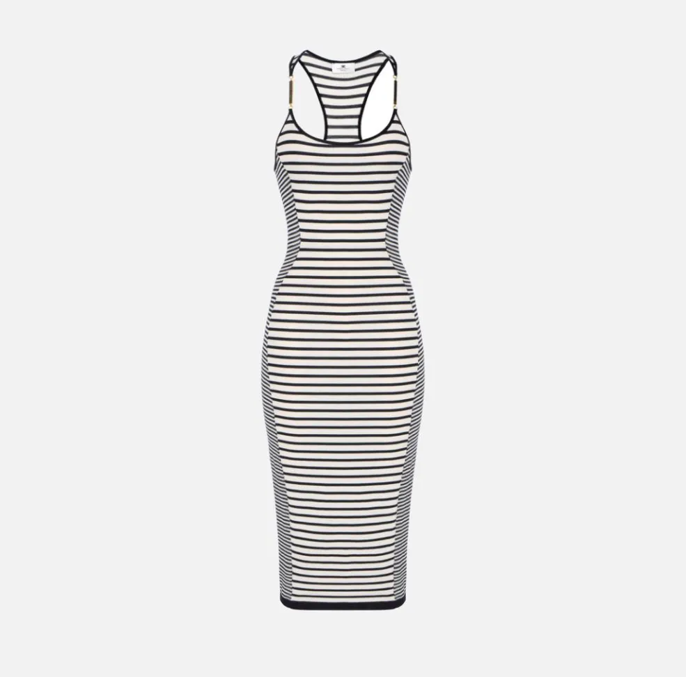 Il mix di righe crea un raffinato gioco grafico che dona movimento al capo e valorizza la figura, rendendo l’abito Elisabetta Franchi dinamico e visivamente slanciato. Le righe, sapientemente distribuite, esprimono un’estetica moderna e sofisticata, capace di interpretare al meglio le tendenze contemporanee senza rinunciare all’eleganza iconica del brand.