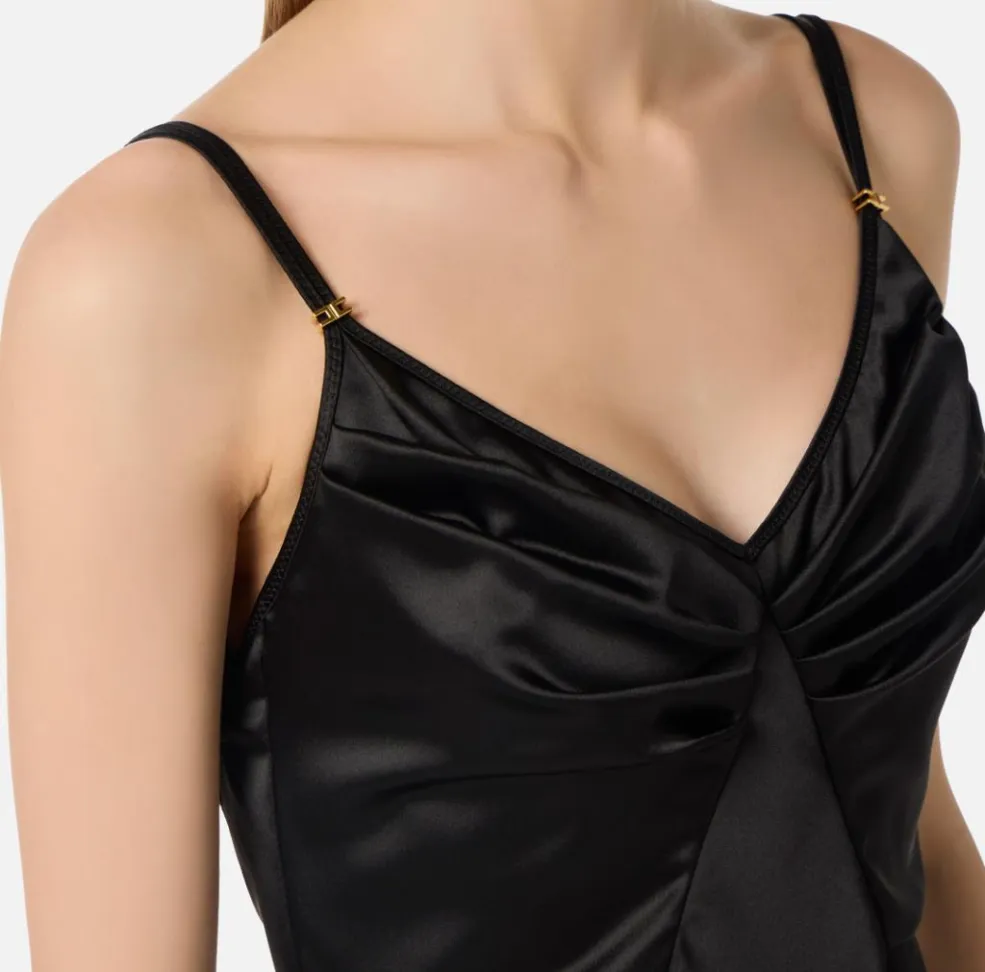Il tessuto setoso accarezza il corpo e riflette la luce con un effetto brillante ma raffinato, perfetto per cerimonie, eventi esclusivi e serate di gala. Il design essenziale, arricchito da dettagli ricercati, crea un equilibrio perfetto tra sensualità e classe.