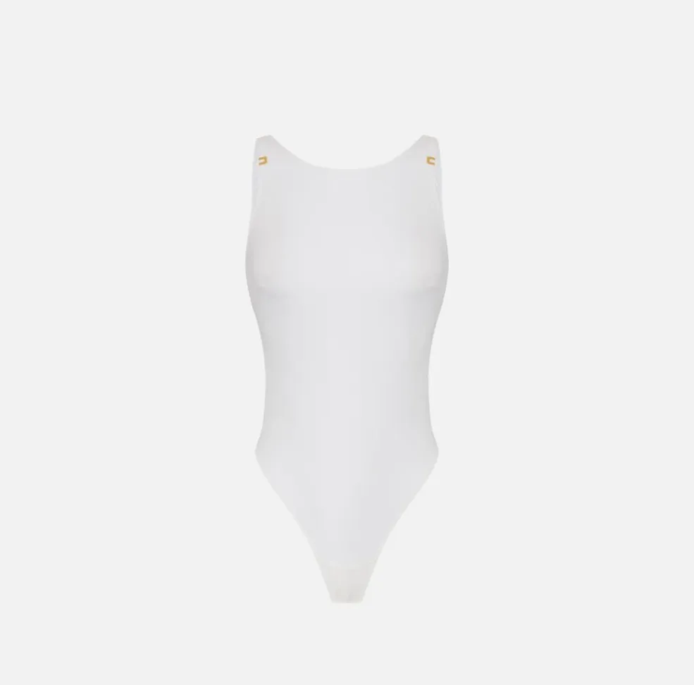 Ideale per occasioni formali, appuntamenti di lavoro o eventi serali, il body in jersey crêpe con dettagli logo si inserisce perfettamente in uno stile elegante e deciso, pensato per una donna sicura di sé che ama distinguersi con classe.