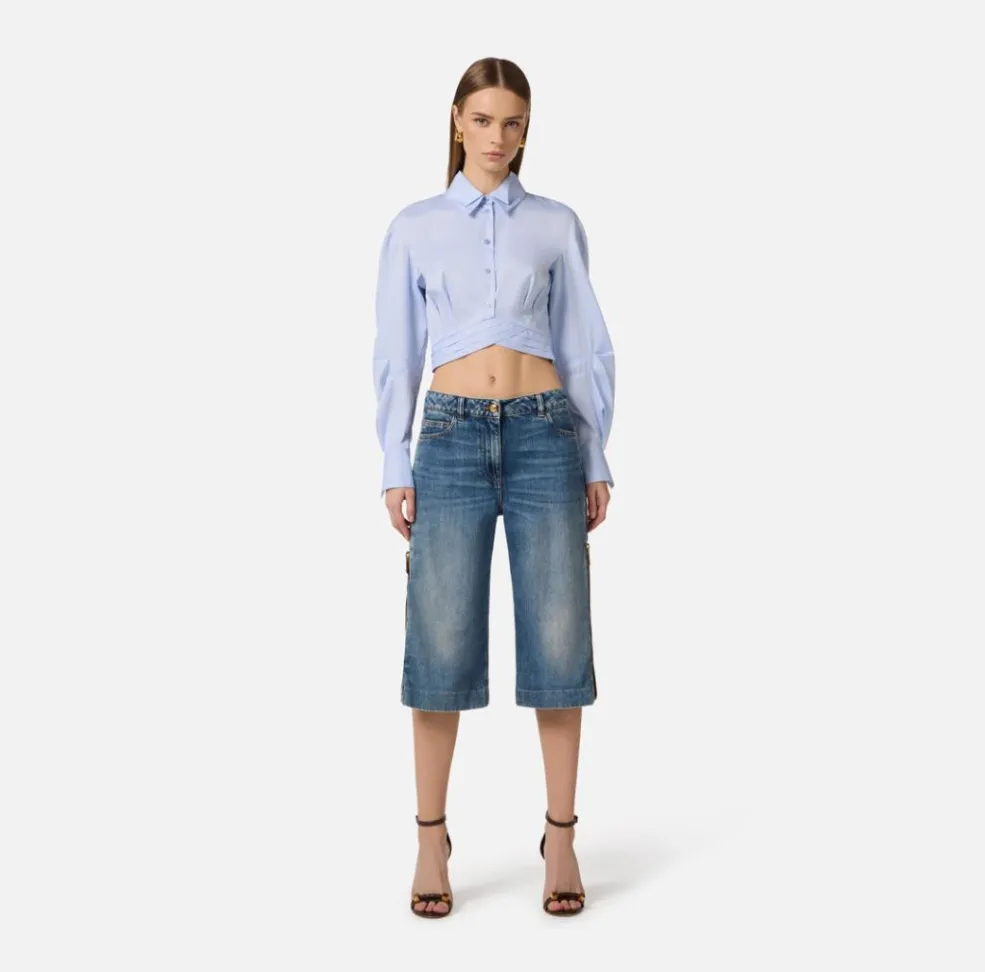Elemento distintivo del modello è il fascione in vita, che definisce la silhouette e valorizza il punto vita, donando un tocco femminile e contemporaneo. Questo dettaglio sartoriale trasforma la classica camicia bianca in un capo iconico, raffinato e perfettamente in linea con l’estetica Elisabetta Franchi, che da sempre celebra la femminilità attraverso le linee eleganti e i dettagli curati.