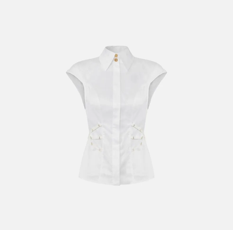 Il colletto classico dona un’allure formale e sofisticata, mentre la vestibilità slim valorizza la silhouette con naturalezza. Sui fianchi, gli elastici di ispirazione lingerie disegnano un raffinato motivo geometrico, creando un effetto visivo armonioso e sensuale. Questo dettaglio, ricercato e moderno, rende la camicia unica nel suo genere e in perfetto equilibrio tra eleganza e audacia.