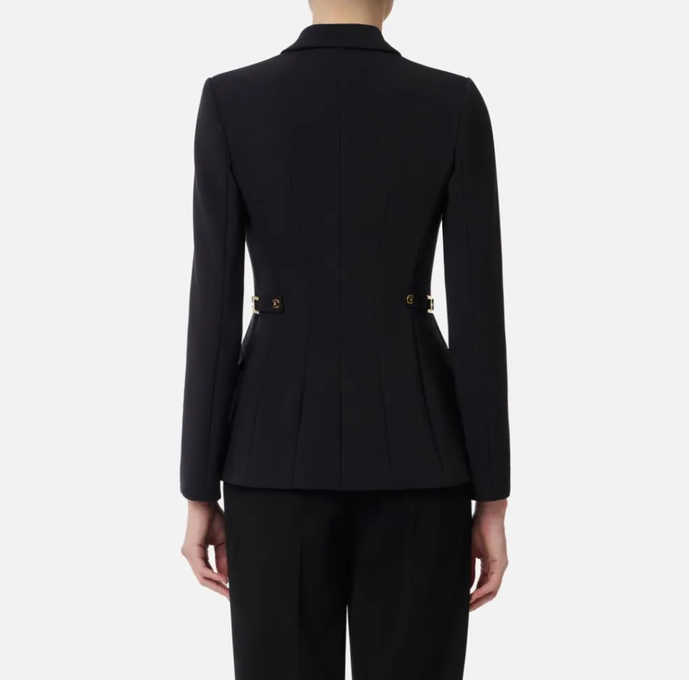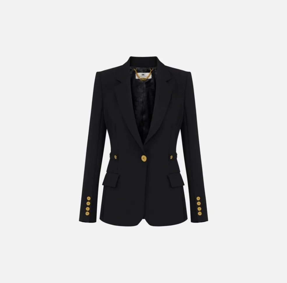 Questa giacca firmata Elisabetta Franchi unisce la raffinatezza del taglio sartoriale alla preziosità dei dettagli gioiello. Realizzata in crêpe leggero, è caratterizzata da una linea fluida e femminile, ideale per completare outfit sofisticati con un tocco di luce.