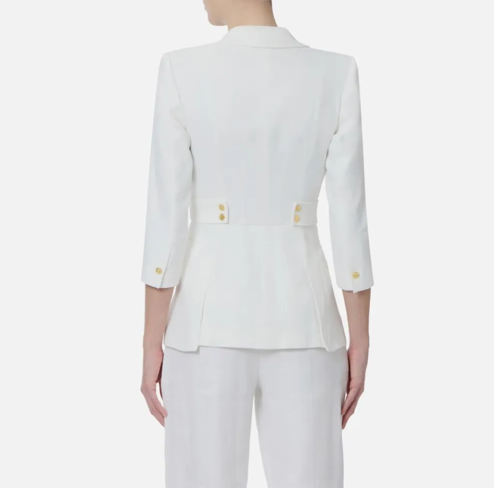 La giacca in misto lino ELISABETTA FRANCHI è un capo sofisticato e versatile, pensato per la donna che desidera unire eleganza, comfort e stile nelle stagioni più calde. Realizzata in un pregiato tessuto misto lino, offre una vestibilità leggera e traspirante, mantenendo al tempo stesso una struttura impeccabile e una linea sartoriale ben definita.