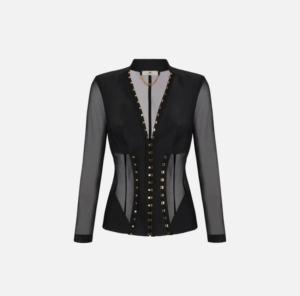 Realizzata in tessuto bielastico di alta qualità, garantisce una vestibilità impeccabile e confortevole, adattandosi alle forme senza costringere. Gli inserti in tulle aggiungono un raffinato gioco di trasparenze che dona leggerezza e sensualità al design, creando un equilibrio perfetto tra seduzione e classe. La costruzione bustier esalta il punto vita e il décolleté, rendendo il capo ideale per occasioni speciali, eventi serali o look da sera di forte impatto.