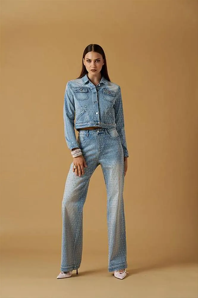 Le applicazioni di diamanti decorativi sono posizionate con cura per valorizzare la linea del capo senza risultare eccessive, donando luce e carattere anche agli outfit più semplici. La vestibilità è studiata per adattarsi armoniosamente alla silhouette, rendendo il giubbino perfetto sia indossato aperto su top e abiti, sia chiuso per un look più deciso e strutturato.