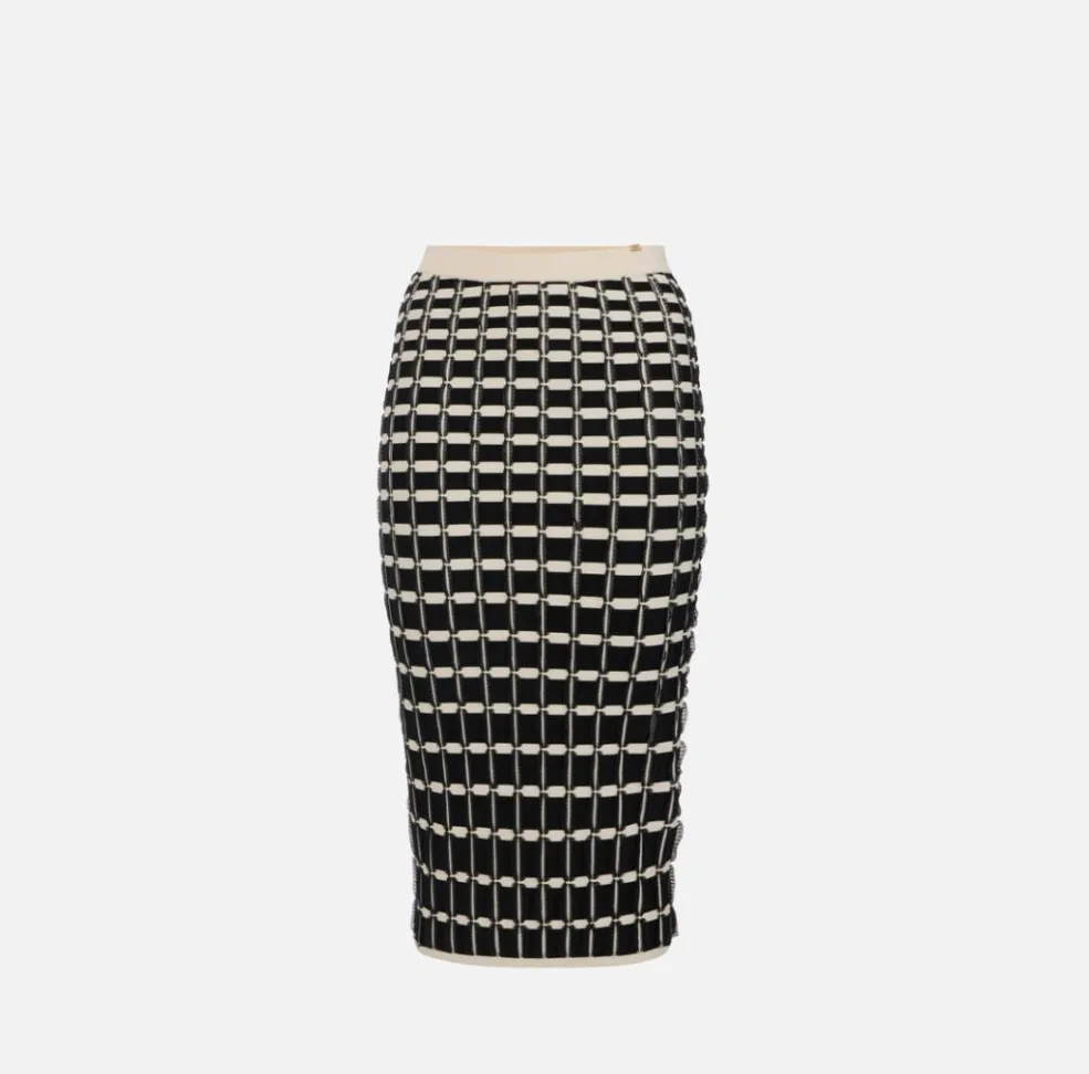 Il dettaglio luminoso è dato dalla placca in metallo dorato con logo, che completa il design con un tocco esclusivo. Con una lunghezza di 74 cm per la taglia 40 IT e una vestibilità aderente, questa gonna è ideale per abbinamenti con top o camicie eleganti per creare outfit raffinati.