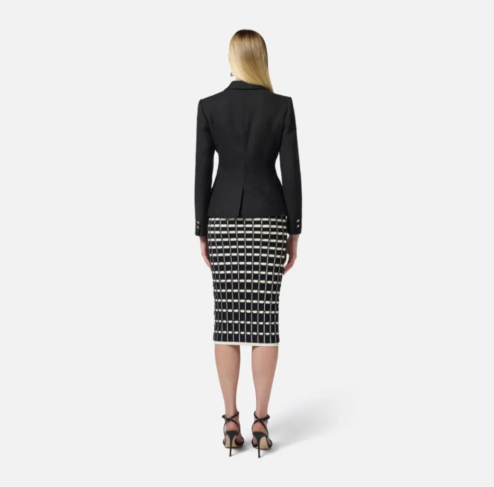 La gonna Elisabetta Franchi in viscosa è un capo elegante e versatile, pensato per valorizzare la silhouette con la sua linea a tubino e il design ricercato. Il motivo elaborato di micro ruches a contrasto aggiunge dinamismo e originalità, rendendo questo capo unico e d'impatto.