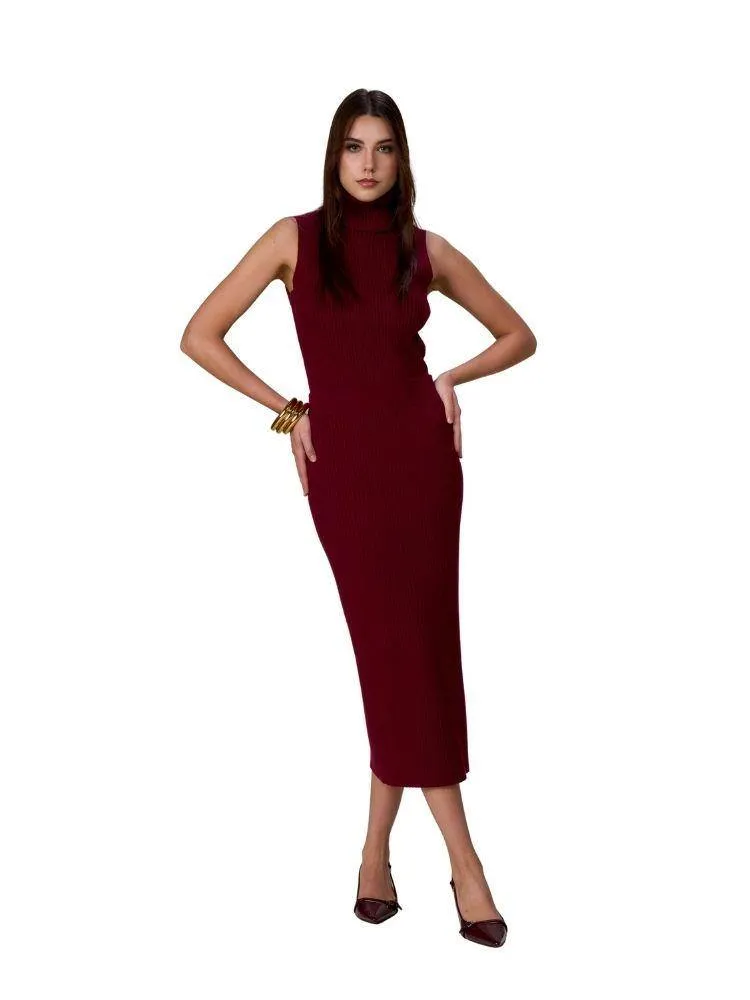 La maglia senza maniche abbraccia il busto con una vestibilità asciutta e strutturata, mentre il collo alto aggiunge un tocco sofisticato, ideale per i mesi più freschi. La gonna a tubino midi, con taglio longuette sotto il ginocchio, segue la silhouette in modo armonioso, offrendo una figura slanciata e femminile.