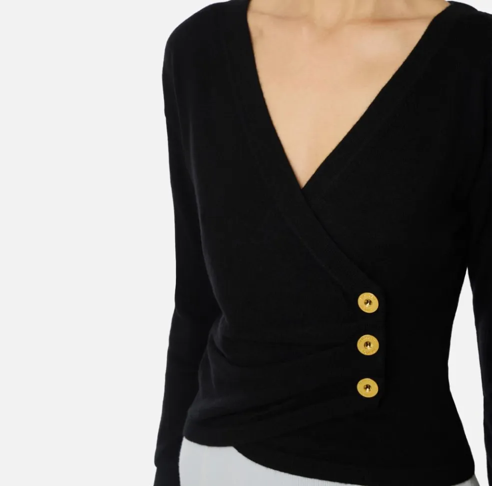 Perfetta da indossare sia di giorno che di sera, questa maglia può essere facilmente abbinata a pantaloni sartoriali per un look da ufficio raffinato, oppure a una gonna in tessuto fluido o in pelle per un outfit più grintoso e di tendenza. I bottoni gioiello aggiungono un dettaglio prezioso che la rende adatta anche a occasioni speciali, dove un tocco di luce fa la differenza.