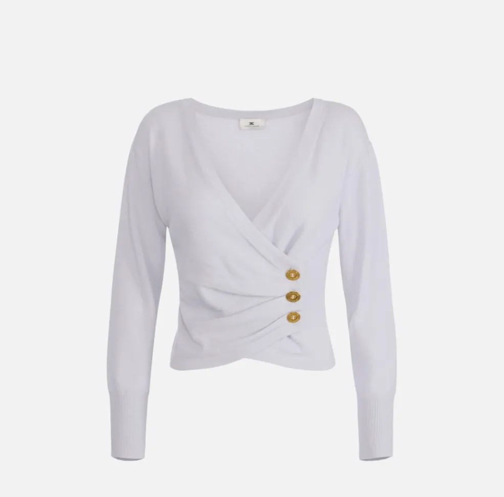 Perfetta da indossare sia di giorno che di sera, questa maglia può essere facilmente abbinata a pantaloni sartoriali per un look da ufficio raffinato, oppure a una gonna in tessuto fluido o in pelle per un outfit più grintoso e di tendenza. I bottoni gioiello aggiungono un dettaglio prezioso che la rende adatta anche a occasioni speciali, dove un tocco di luce fa la differenza.