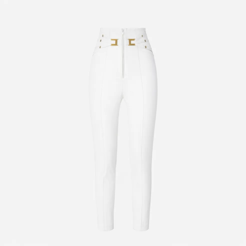 Realizzati in doppio crêpe stretch, offrono una struttura compatta e al tempo stesso elastica, capace di adattarsi armoniosamente alle forme. Il tessuto garantisce una caduta fluida e ordinata, mantenendo la linea del pantalone sempre pulita e definita anche dopo molte ore di utilizzo. La presenza della componente stretch rende il capo estremamente confortevole, ideale per affrontare giornate intense tra lavoro, appuntamenti e momenti di relax.