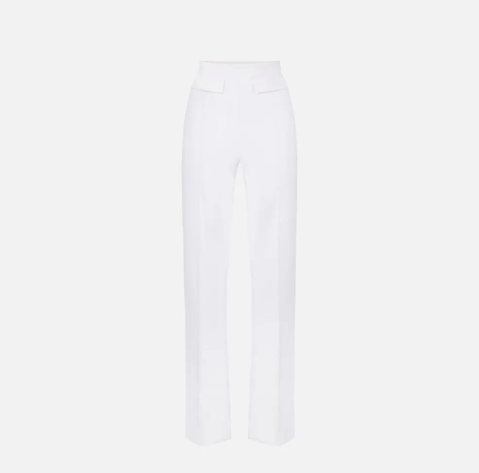 I pantaloni in doppio crêpe stretch con logo ricamato rappresentano un capo essenziale del guardaroba femminile elegante, pensato per valorizzare la silhouette con stile e comfort. Realizzati in un tessuto doppio crêpe stretch di alta qualità, assicurano una vestibilità perfetta, capace di accompagnare i movimenti senza rinunciare a una struttura sartoriale impeccabile.