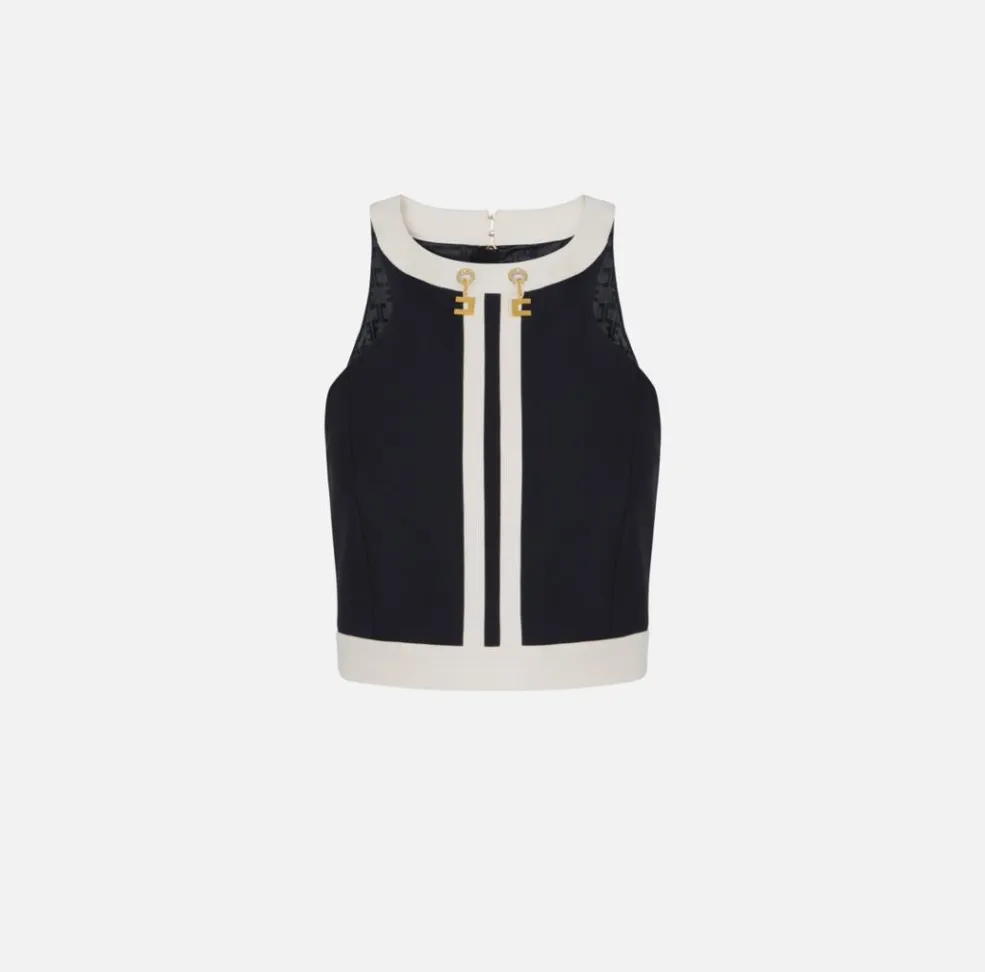 Questo top firmato Elisabetta Franchi è realizzato in doppio crêpe, un tessuto strutturato e raffinato che dona al capo un’eleganza contemporanea. Il design color-block gioca su contrasti netti e armoniosi, creando una silhouette visivamente slanciata e grintosa.