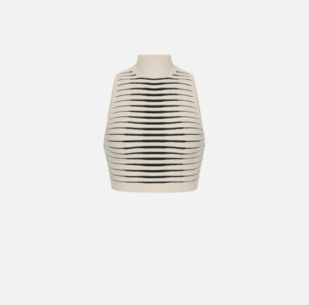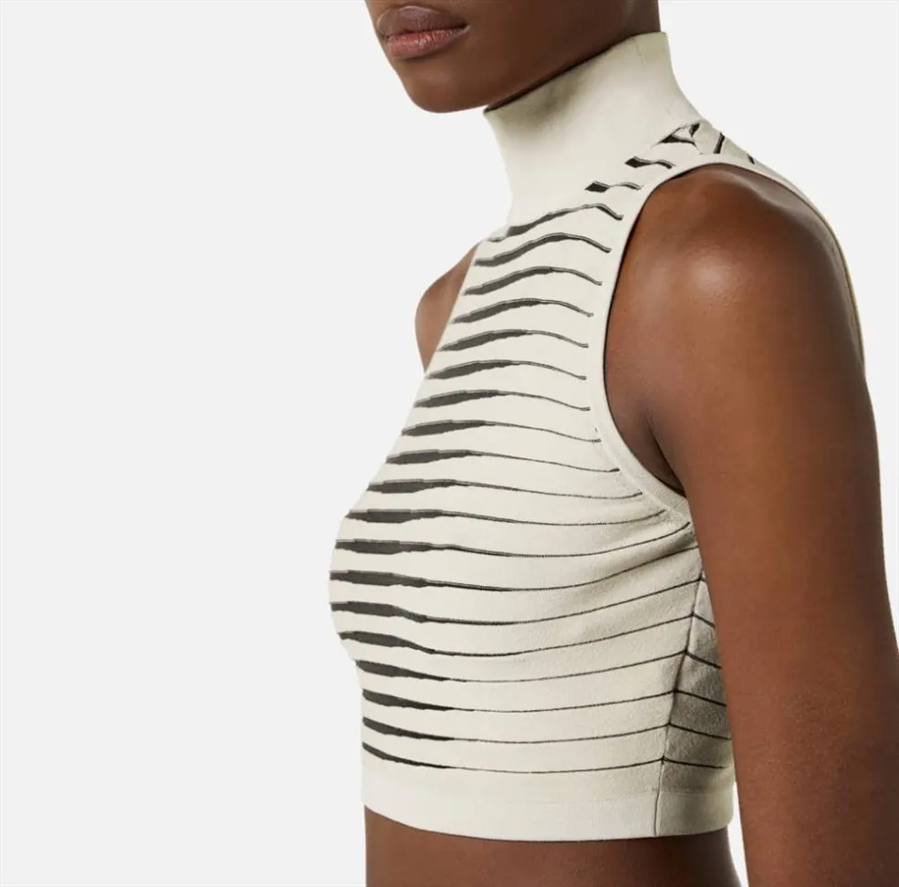 Il top in maglia a righe dégradé Elisabetta Franchi è un capo raffinato e di grande impatto visivo, pensato per la donna che ama distinguersi con eleganza anche nei look più essenziali. Un modello che unisce la qualità della lavorazione in maglia a un motivo grafico ricercato, capace di valorizzare la silhouette con delicatezza e stile.