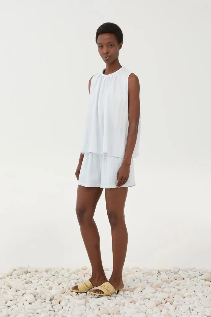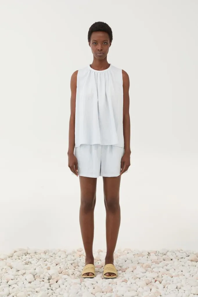 Il design presenta uno scollo tondo con delicata arricciatura, dettaglio che aggiunge movimento e leggerezza al capo senza rinunciare alla semplicità. La struttura smanicata lascia scoperte le spalle, donando al top un’allure fresca e contemporanea, perfetta per affrontare le giornate più calde con stile.
