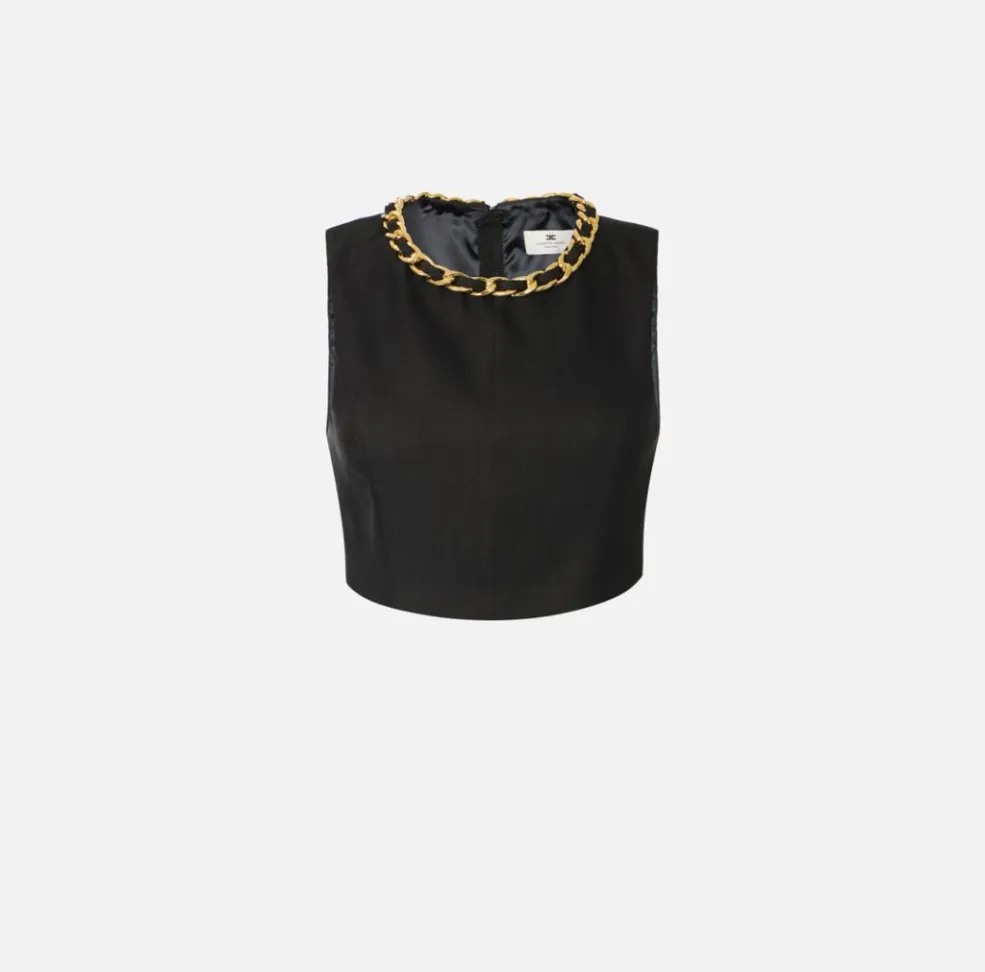 La silhouette è essenziale e femminile, studiata per valorizzare la figura con naturalezza. Il vero protagonista è il dettaglio della catena gioiello, elemento iconico e distintivo che illumina il décolleté e dona carattere al capo. Questo particolare prezioso trasforma un top minimal in un pezzo di forte personalità, perfetto sia per il giorno che per la sera.
